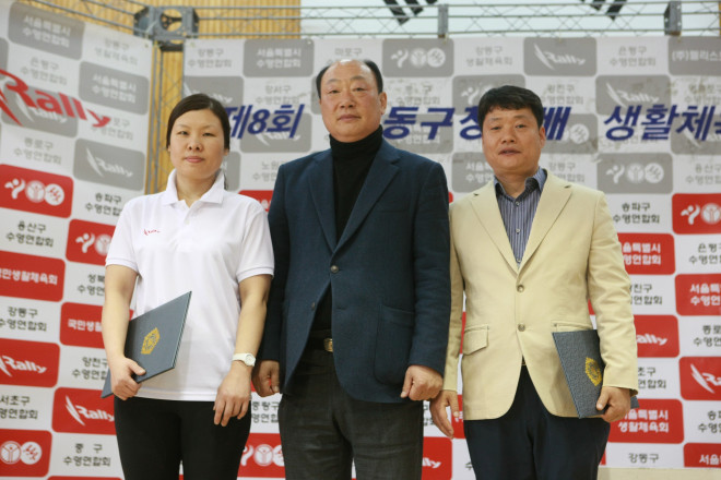 김영철 서울 강동구의회 의원(사진 가운데)이 지난 29일 성내동 성일문화체육센터에서 열린 '제8회 강동구청장배 생활체육 수영대회' 에 참석, 구민 건강 증진 및 수영연합회 활성화에 기여한 이들에게 감사장을 수여하고 있다.