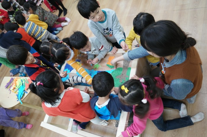 | ▲ 지난달 30일 서울 은평구민체육센터 2층 유아스포츠단(이하 유스단) 교실에서 은평시설관리공단이 추진하는 ‘더불어 숲’의 농작물 재배를 위해 마련한 목화분을 유스단 아이들이 자연풍경 및 애니메이션 캐릭터 등 다양한 그림으로 꾸미고 있다. (사진제공=은평시설관리공단) | ||