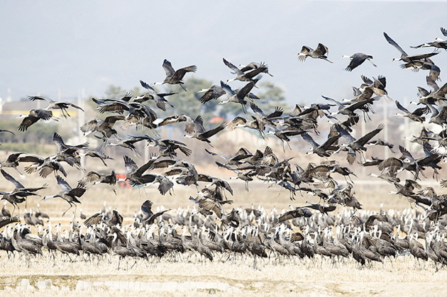 환경부는 지난 13일부터 26일까지 충남 태안 천수만을 찾은 겨울 철새 진객 흑두루미(멸종위기야생동식물 2급) 모습을 31일 공개했다.