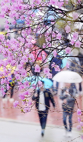 봄비가 내린 31일 성북구 고려대학교에서 학생들이 우산을 쓰고 진달래가 활짝 핀 교정을 거닐고 있다.