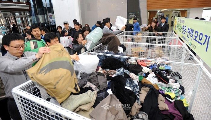 송파구가 3일까지 진행하는 '자원재활용품 모으기 행사'를 위해 구청 1층에 설치한 수거함에 직원들이 직접 가져온 헌옷을 기부하고 있다.(사진제공=송파구청)