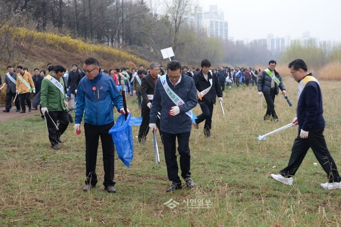 인천 연수구가 1일 '2015 새봄맞이 클린업 데이' 행사를 개최했다. 이날 행사에는 주민과 유관기관, 공무원 등 1000여명이 참여해 환경정비 활동을 펼쳤다. 사진은 이날 참여자들이 쓰레기를 수거하고 있는 모습. (사진제공=연수구청)