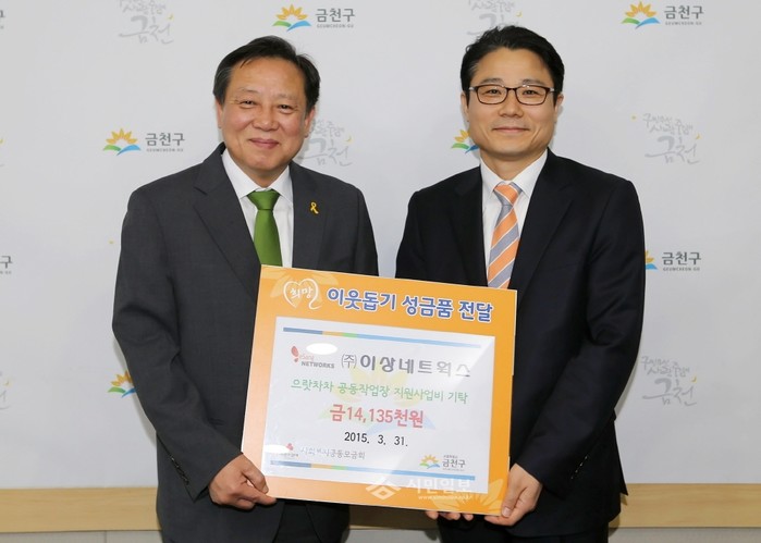 서울 금천구가 지난달 31일 오전 10시 구청장실에서 지역내 기업으로부터 3000만원 상당의 사회공헌금을 유치, 기탁식을 개최해 차성수 금천구청장과 조원표 (주)이상네트웍스 대표가 사진을 찍고있다.(사진제공=금천구청)
