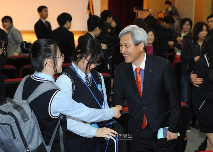 경기 오산시청 대회의실에서 지난달 31일 '2015 일반고 얼리버드 프로그램 입학식'이 개최됐다. 이날 입학식에 참석한 곽상욱 오산시장(오른쪽)은 프로그램에 참가하는 학생들에게 축하의 말을 전했다. (사진제공=오산시청)