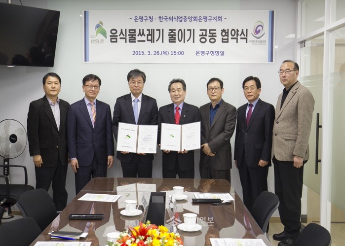 서울 은평구는 최근 한국외식업중앙회 은평구지회와 음식물쓰레기 줄이기 공동협약을 체결했다. 사진은 김우영 은평구청장(왼쪽에서 세 번째)이 관계자들과 협약식에서 기념촬영한 모습. (사진제공=은평구청)