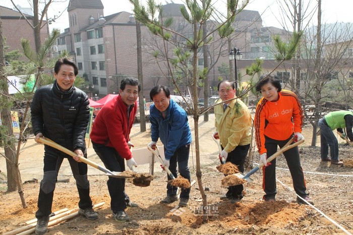 서울시 강동구의회 성임제 의장을 비롯한 의원들이 지난달 30일 명일근린공원에서 개최된 '강동도시숲 만들기 주민 기념식수 행사'에 참석해 나무를 심기 위해 삽으로 흙을 덮고 있는 모습.(사진제공=강동구의회)