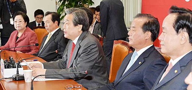 1일 오전 서울 여의도 국회 새누리당 대표실에서 열린 최고중진연석회의에서 김무성 대표가 공무원연금 개혁 논의를 위한 실무기구 구성 협상이 난항을 빚고 있는 것과 관련 “약속과 의지가 정치적 이해득실에 따라 이리저리 흔들려서는 안 된다”고 이야기하고 있다.