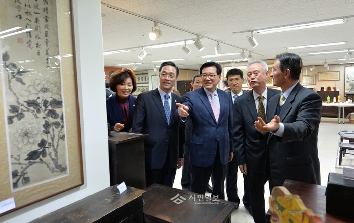 서울 동대문구가 최근 유덕열 동대문구청장을 비롯한 문화계 초청인사 및 지역내 주민 100여명이 참석한 가운데 '동대문 고미술 문화관 개관식'을 열었다. 사진은 유덕열 구청장(가운데)이 관계자들과 미술품을 살펴보고 있는 모습.(사진제공=동대문구청)