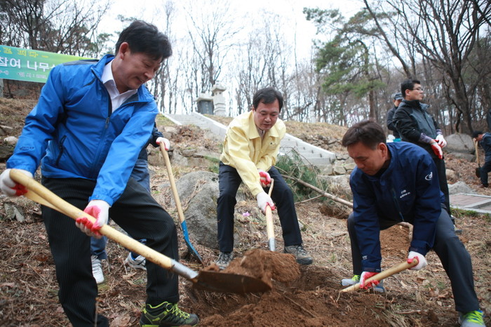 서울 강북구는 최근 북한산 국립공원내 신숙묘지 일대에서 제70회 식목일을 맞아 주민 150명과 함께 나무 심기 행사를 진행했다. 사진은 이날 행사에 참여한 박겸수 강북구청장(가운데)이 주민들과 나무를 심고 있는 모습. (사진제공=강북구청)