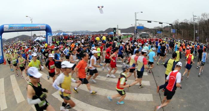 [광명=류만옥 기자]통일을 염원하는 '2015년 KTX광명역 통일 전국마라톤 대회'가 5일 경기 광명시 'KTX광명역' 일대에서 화려하게 막을 올린 가운데 1만5000여명의 마라톤어가 참여해 대성황을 이뤘다.