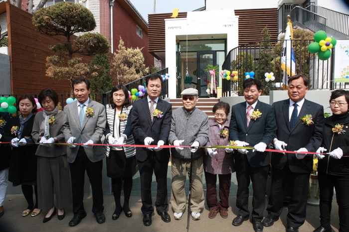 서울 강북구가 최근 우이동에 구립 보육시설인 우이한솔어린이집을 개원했다. 사진은 이날 개원식에 참석한 박겸수 강북구청장(왼쪽에서 다섯 번째)을 비롯한 국회의원, 시·구의원, 주민 등이 테이프 커팅식을 하고 있는 모습. (사진제공=강북구청)