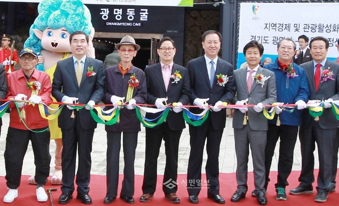 [광명=류만옥 기자]테마파크로 새롭게 단장한 광명동굴 개막식 축제가 4일 동굴입구에서 열렸다. 양기대 광명시장(왼쪽 두번째), 나상성 광명시의회 의장 등 각급기관장들이 참석해 오픈 테이프 커팅을 하고 있다. 한편 광명굴은 올해부터 어른 4000원의 입장료를 받는다.