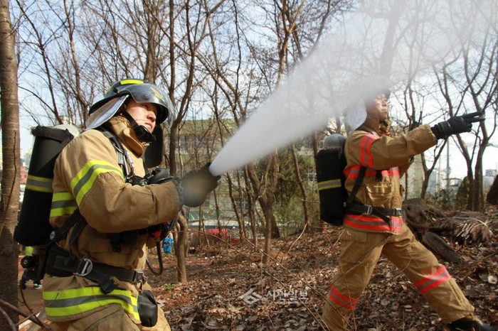 서울 구로소방서가 최근 신속한 초동진화체계를 구축해 산불로 인한 산림피해를 최소화하고자, 구로구 개봉1동 소재 매봉산에서 산불진화 현지적응훈련을 실시했다. 사진은 산불진화 훈련을 하고 있는 소방대원의 모습.(사진제공=구로소방서)