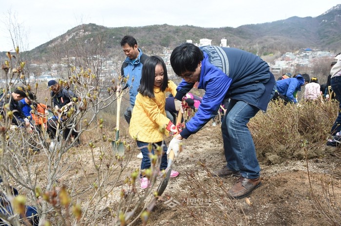 지난 4일 오전 서울 노원구 상계동 불암산 철쭉동산 나무심기 행사에 참석한 가족이 함께 나무를 심고 있다.(사진제공=노원구청)