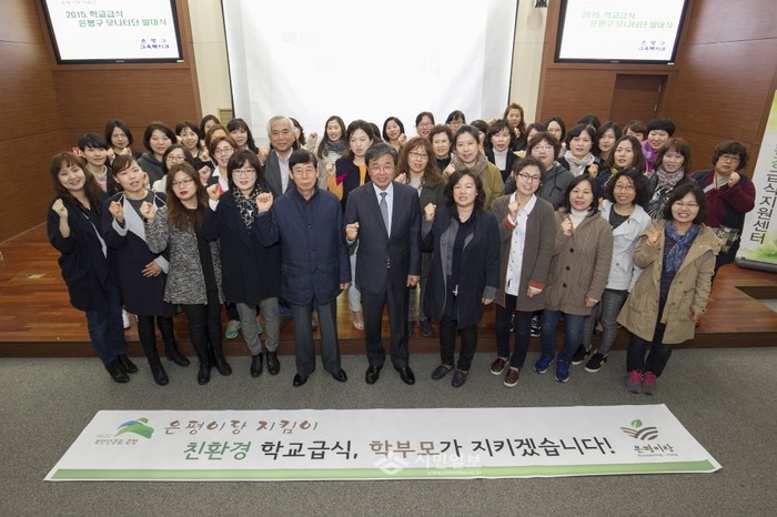 서울 은평구가 최근 실시한 '은평이랑 지킴이, 제3기 학교급식 은평구 모니터단' 발대식에서 김우영 은평구청장(가운데)과 모니터단이 발대식 후 파이팅을 외치며 기념촬영을 하고 있다. (사진제공=은평구청)