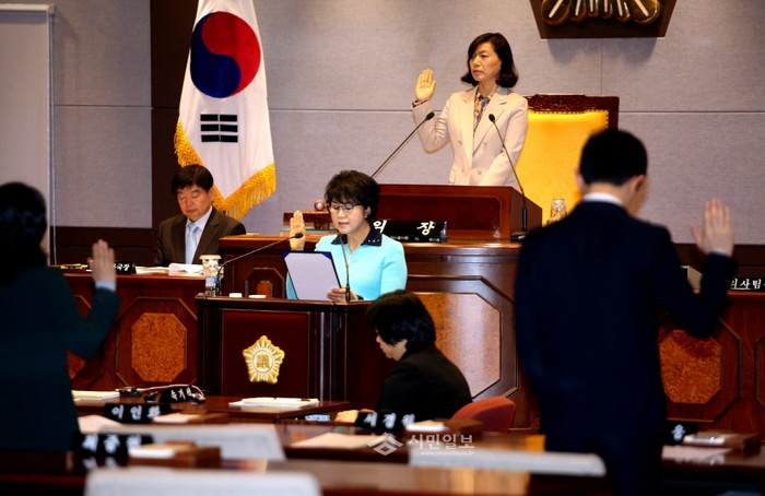 6일 오전 10시 김명옥 서울 강남구의회 의장과 의원들이 의회에서 강남구와 사전협의 없이 지역 특성과 구민 의견을 무시한 서울시의 ‘한전이전 부지 개발구역 확대’ 지정을 반대하는 결의문을 채택하고, 여선웅 의원의 대표발의로 반대결의를 하고 있다.(사진제공=강남구의회)