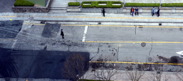 6일 오전 서울 KT 광화문빌딩과 교보타워 사이 도로에서 심한 균열을 보이는 지반 위로 시민들이 아슬아슬 지나고 있다. 한 매체에 따르면 이 부근의 지하로 지하철 종각역에서 광화문역으로 이어지는 지하보도 공사가 이뤄지고 있는데 이 공사 중 이 일대에 건물을 지을 때 토사물이 넘치지 않도록 지지하는 '지중정착장치(어스앵커.Earth-Anchor)'인 철근 구조물을 발견해 제거했고 이로 인해 지반 침하가 일어난 것으로 구청과 시공사가 추정하고 있다고 전했다. 시공사는 이로인해 지난 5개월간 30여차례의 긴급 복구공사를 했다.