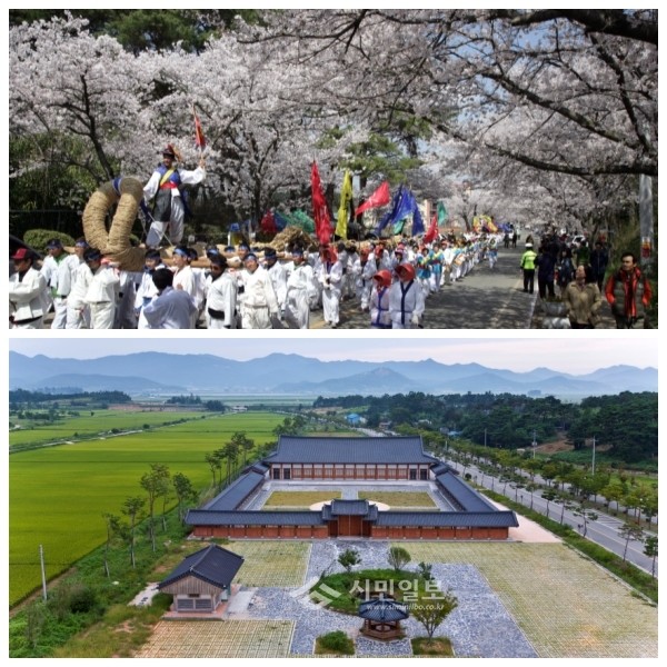 | ▲ (위) '왕인문화축제'의 도포제줄 벚꽃길 행진에 참가한 군민들.(아래) '대한민국한옥건축박람회장' 전경. (사진제공=영암군청) | ||