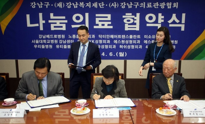 신연희 서울 강남구청장(가운데)이 지난 6일( 사)강남구의료관광협회에 소속된 13개 의료기관과 지역내 저소득층과 취약계층 187명의 의료서비스 제공을 위해 (재)강남복지재단 곽수일 이사장(오른쪽)과 (사)강남구의료관광협회 조상헌 협회장(왼쪽)과 ‘나눔의료 협약’ 체결을 위한 서명을 하고 있다. (사진제공=강남구청)