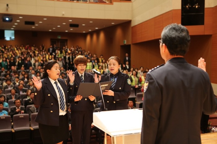경기 용인동부경찰서는 지난 7일 용인시청 3층 에이스홀에서 용인교육지원청 차혜숙 교육장, 정찬민 용인시장, 정찬민 용인시장 등 관계자가 참석한 가운데 녹색어머니회, 어머니폴리스, 학부모폴리스 합동발대식을 개최했다. 사진은 이날 발대식에서 대표자들이 무대로 나와 선서를 하고 있는 모습. (사진제공=용인동부경찰서)