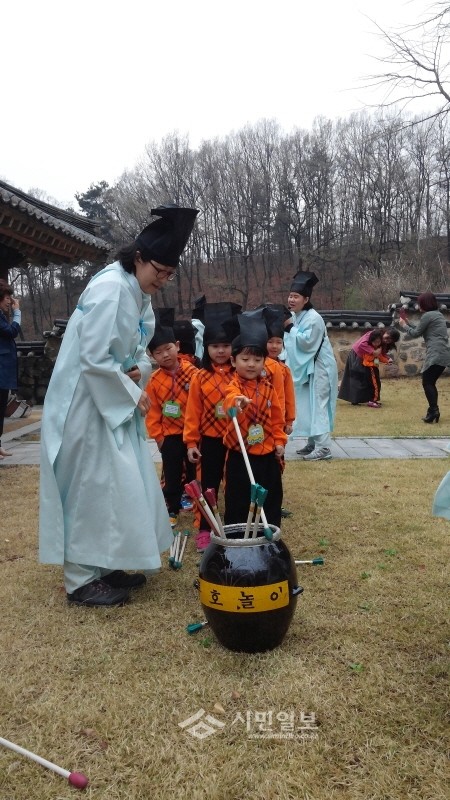 대전 대덕구는 최근 회덕향교에서 지역내 어린이집 어린이들을 대상으로 일일 체험교실을 진행했다. 체험교실에서 어린이들은 향교 행동예절 교육과 전통놀이 체험에 참여했다. 사진은 한 어린이가 투호통에 화살을 던지고 있는 모습. (사진제공=대덕구청)