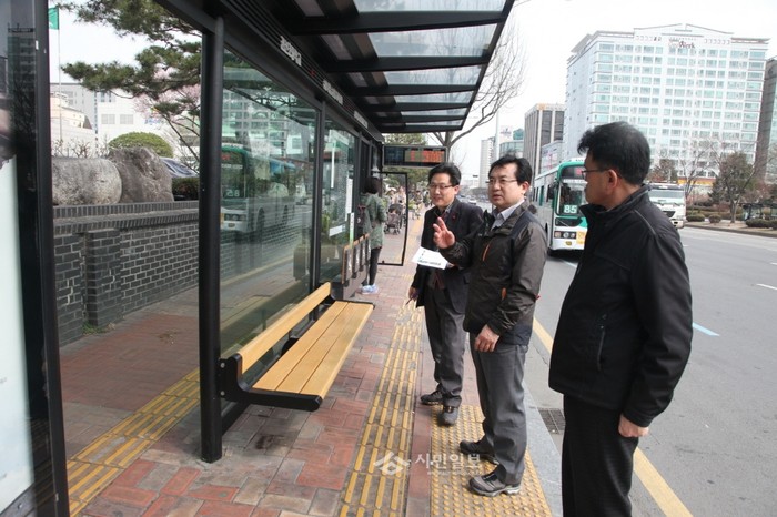 | ▲ 도로포장과 보행환경 개선, 도시녹화, 청소 등 거리환경을 개선을 위해 한 버스승강장을 방문한 박흥식 구청장이 청소문제에 대해 관계자들과 의논하고 있다.(사진제공=팔달구청) | ||