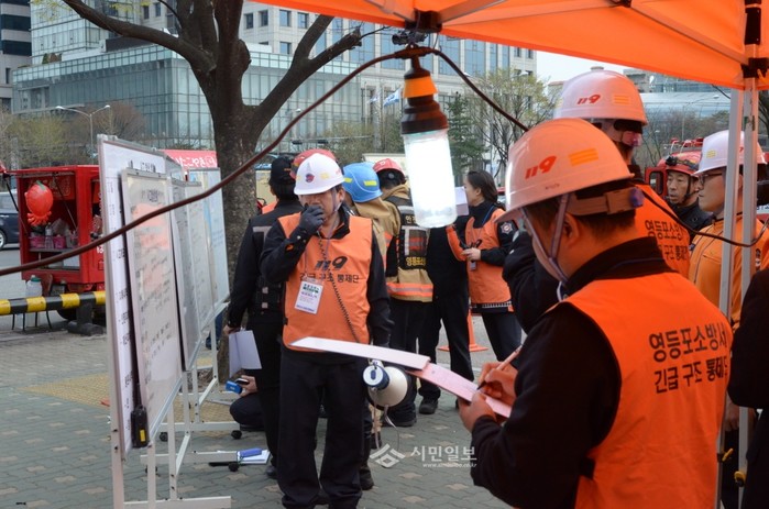 서울 영등포소방서가 최근 여의도에 위치한 한화생명빌딩을 대상으로 불시 긴급구조통제단 가동 훈련을 실시했다. 사진은 소방관들이 재난사고에 대비해 담당임무를 숙지하고 점검하고 하고 있는 모습.(사진제공=영등포소방서)