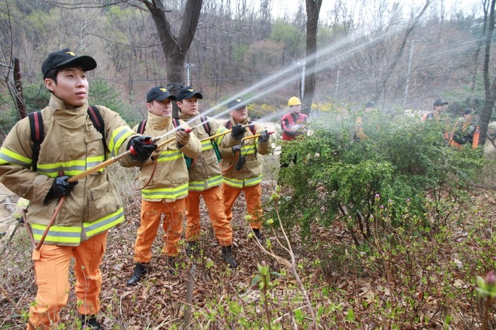 서울 구로소방서는 지난 8일 오후 2시 산불 취약 시기인 봄철을 맞아 유사시 신속하고 효율적인 현장지휘 및 초기 산불진화능력을 향상시켜 시민 생활안정을 도모하고자 산불진압훈련을 실시하고 있다. (사진제공=구로소방서)