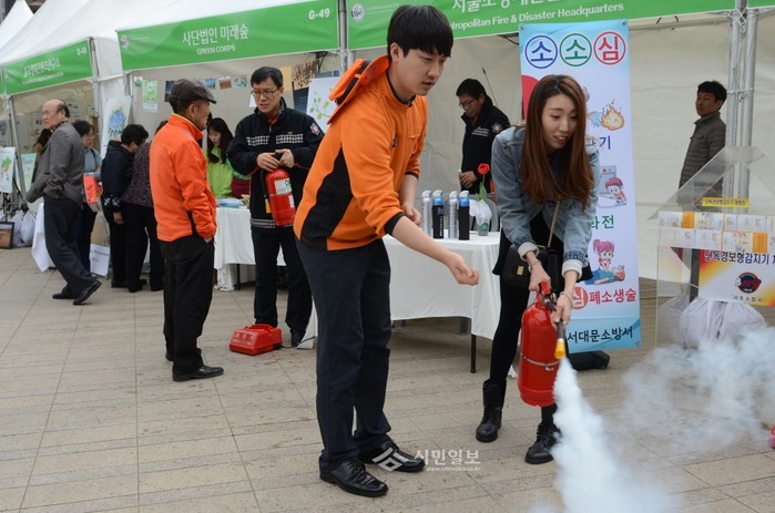 서울 서대문소방서는 지난 8일 서울시청앞 광장 행사장에서 찾아가는 '119안전체험 코너'를 운영했다. 이날 체험에는 가족 단위의 시민들이 참여해 소화기종류별 사용법 등 다양한 체험활동을 실시했다. 사진은 체험에 참여한 한 시민이 소화기 사용법을 배우고 있는 모습. (사진제공=서대문소방서)