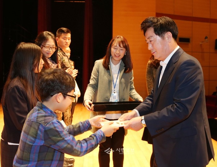 지난 8일 경기 용인시가 용인시민 모두가 한 권의 책을 읽는 독서운동의 일환인 '한 책, 하나된 용인' 독서선포식을 시청 문화예술원 3층 마루홀에서 개최했다. 사진은 이날 선포식에서 책을 전달하는 정찬민 용인시장(오른쪽)의 모습. (사진제공=용인시청)