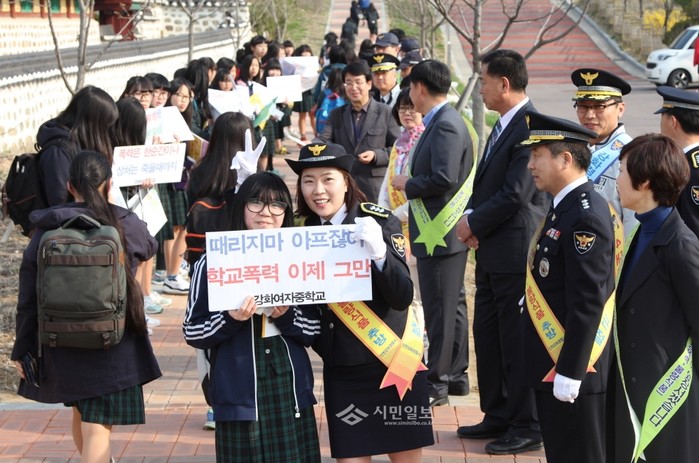 인천 강화경찰서는 9일 강화여자중학교 앞에서 강화출신 경찰관 및 자녀를 둔 학부모 경찰관 9명을 비롯한 50여명과 함께 '학교폭력 예방 캠페인'을 전개했다. 사진은 이날 참여자들이 캠페인을 진행하며 기념촬영한 모습. (사진제공=강화경찰서)