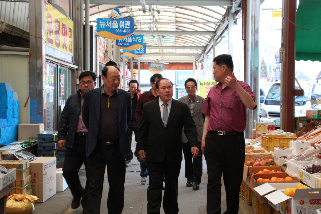 | ▲ 지역경제 활성화를 위해 보령중앙시장을 방문한 연구회원들이 시장내부를 살펴보고 있다. | ||