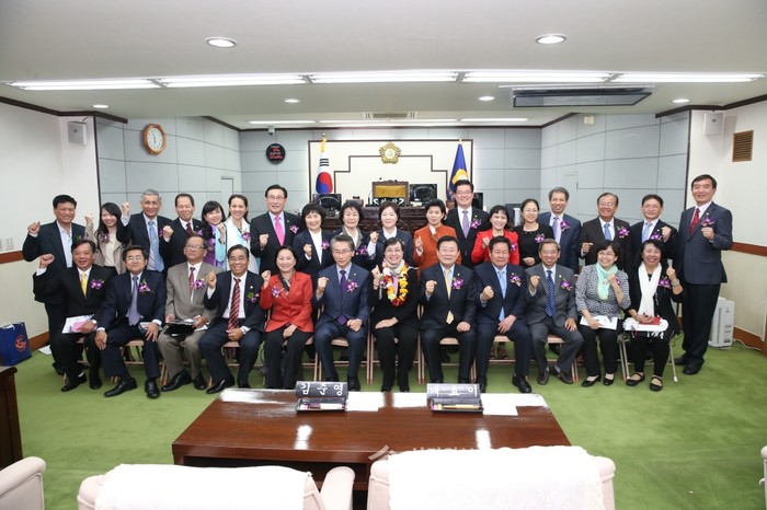 지난 5일 서울 종로구의회와 호치민시 인민의회의 우호관계 수립을 위해 개최한 간담회를 마치고 종로구의회 김복동 의장과 의원, 호치민시 인민의회 응우옌 티 꾸옛 땀 의장과 대표단, 김영종 종로구청장이 양 지역의 새로운 우호관계 수립과 교류증진을 위한 간담회를 마치고 기념사진을 촬영하고 있다.(사진제공=종로구의회)