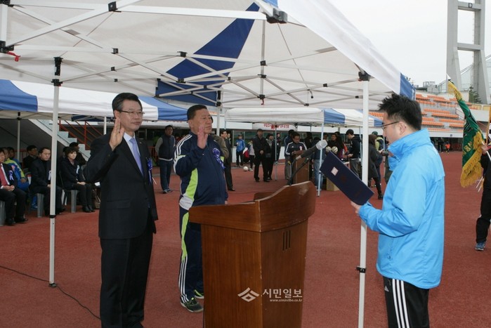 최근 서울 용산구 효창운동장에서 열린 '제37회 용산구청장기 국민생활체육 축구대회'에 참석한 성장현 용산구청장(왼쪽)이 개회선언을 하고 있다. (사진제공=용산구청)