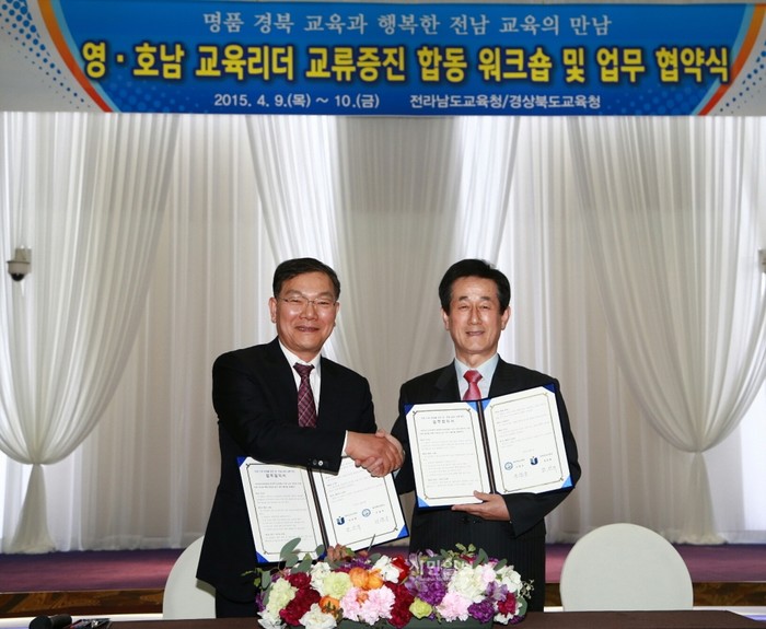 라남도 교육청이 최근 경상북도 교육청과 관계공무원 등 70여명이 참석한 가운데 '영·호남 교육리더 교류증진을 위한 합동 워크숍'을 개최하고, 업무협약을 맺었다. 사진은 이날 워크숍에서 장만채 전남교육감(왼쪽)과 이영우 경북교육감이 협약을 맺은 후 기념 촬영한 모습.(사진제공=전남교육청)