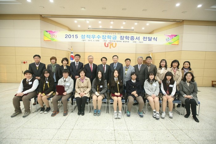 서울 구로구 장학회가 최근 동 장학회와 함께 지역내 성적우수장학금 장학증서 전달식을 했다. 장학금 대상은 지역내 중학교 졸업 후 지역내 고등학교로 진학하는 학생 중 성적 상위 3% 이내 학생 총 50명이다. 사진은 전달식에서 이성 구로구청장(뒷줄 가운데)과 참석자들이 기념촬영한 모습. (사진제공=구로구청)