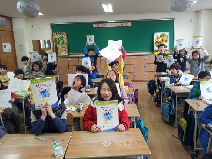 경기 부천시 성곡초등학교가 최근 독서교육의 활성화를 위해 자체 독후활동 기록집을 제작해 3학년 학생들을 대상으로 독서교육을 실시하고 있다. 사진은 성곡초 학생들이 독서활동 후 독서활동 기록집을 들고 기념촬영한 모습. (사진제공=부천교육지원청)
