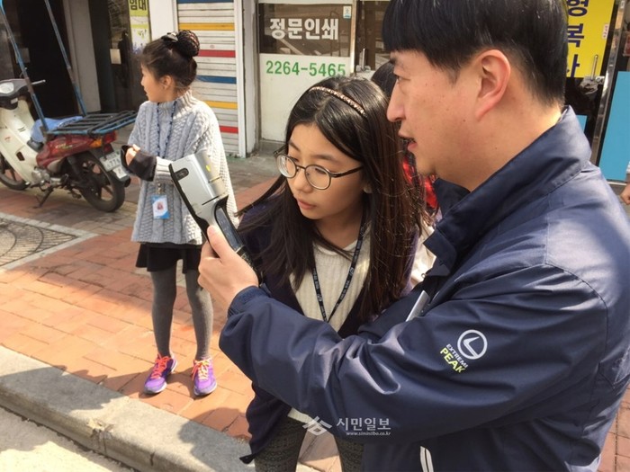 최근 서울 중구가 ‘안전하고 건강한 학교만들기 사업'의 일환으로 실시한 ‘생생한 행정체험 공무원 체험교실’에 참가한 광희초등학교 학생들이 관련 공무원들과 함께 주·정차 단속업무를 체험하고 있다.(사진제공=중구청)