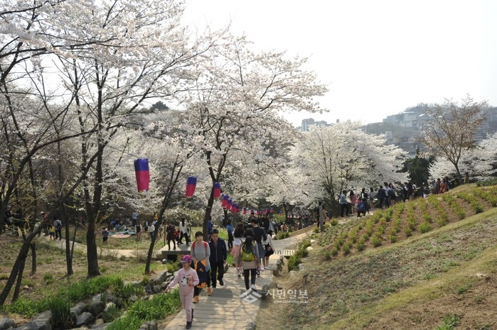 지난 11일 주말을 맞아 벚꽃이 만개한 서울 서대문구 안산(鞍山)을 찾은 시민들이 기념사진을 찍으며 경치를 만끽하고 있다. 특히, 서대문구는 안산에서 14일까지 '안산 자락길 벚꽃음악회'를 연다. (사진제공=서대문구청)