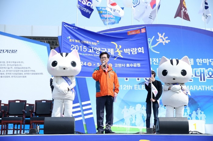 경기 고양시가 최근 '2015 고양국제꽃박람회'의 성공 개최를 위해 서울 신촌 일대에서 기동홍보를 실시했다. 사진은 이날 홍보에 참여한 최성 고양시장이 무대에 올라 홍보 중인 모습. (사진제공=고양시청)