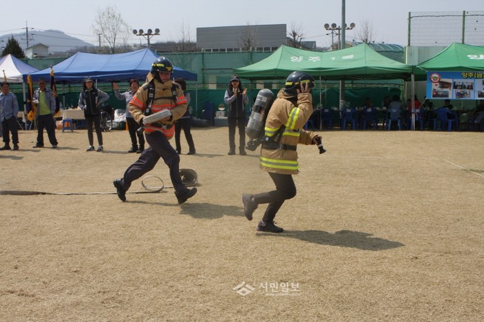 경기 양주소방서는 지난 11일 소방서 후정에서 의용소방대 소방기술향상과 화합을 위해 '의용소방대 소방기술경연 및 체육대회'를 개최했다. 사진은 이날 행사에서 소방대원들이 '속도방수 경연대회'에 참여 중인 모습. (사진제공=양주소방서)