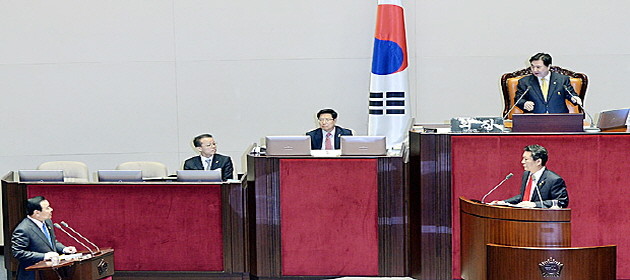 13일 오전 서울 여의도 국회에서 열린 본회의에서 이완구(왼쪽) 국무총리가 정청래 새정치민주연합 의원의 질의에 답하고 있다.