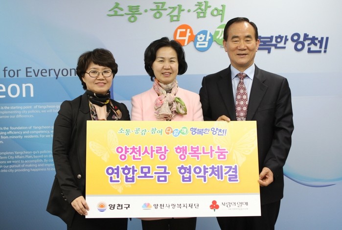 서울 양천구는 최근 양천사랑복지재단, 서울사랑의 열매와 함께 '양천사랑 행복나눔' 연합모금 협약식을 했다. 이로써 구는 내년 2월 말까지 20억원 모금을 목표로 연합모금을 추진하게 된다. 사진은 김수영 구청장(가운데)과 관계자들이 협약식에서 기념촬영한 모습. (사진제공=사랑의열매)