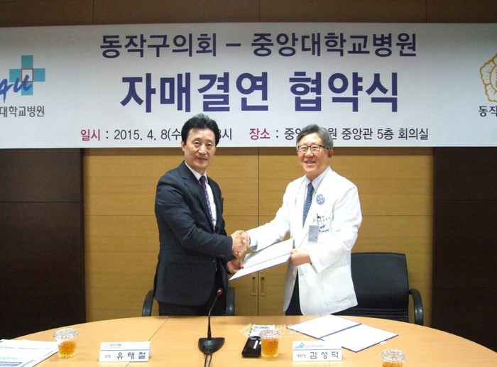 최근 동작구의회와 중앙대학교병원은 의료서비스지원 협력체계를 구축하고 상호유대관계를 강화해 양 기관이 지속적인 발전을 도모하고자 진료협약을 체결했다. 사진은 협약체결 후 기념촬영중인 유태철 동작구의회의장(왼쪽)의 모습. (사진제공=동작구의회)