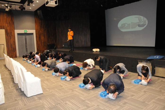 지난 13일 서울 서대문소방서는 신촌현대백화점 U-FLEX 강당에서 심정지환자 소생률 상승을 위한 심폐소생술 교육을 실시했다. 사진은 심폐소생술 실습교육을 받고 있는 직원들의 모습. (사진제공=서대문소방서)