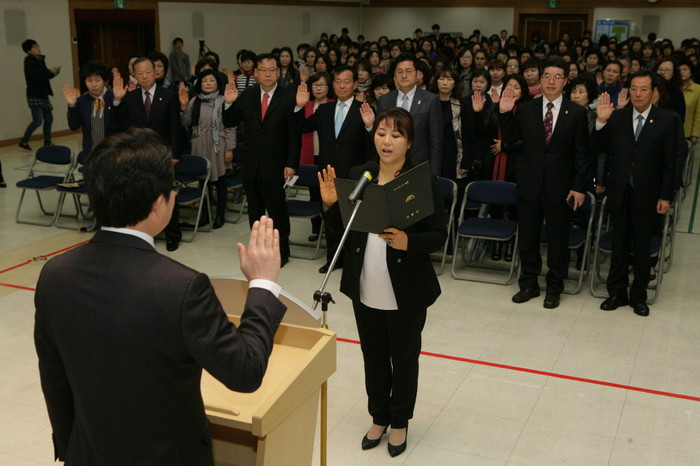 서울 성동구가 14일 구청 대강당에서 정원오 성동구청장을 비롯해 300여명이 참석한 가운데 여성친화도시 서포터즈 발대식을 가졌다. 사진은 이날 참여자들이 선서를 하고 있는 모습.(사진제공=성동구청)