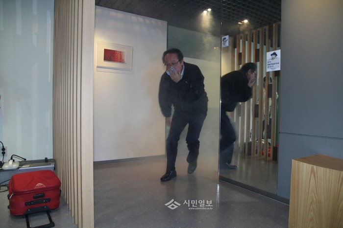 서울 동작소방서는 지난 14일 사당동에 위치한 한국 스파이렉스 사코 직원들을 대상으로 소방안전교육을 실시했다. 사진은 교육에 참여한 한 직원이 연기대피체험을 진행 중인 모습. (사진제공=동작소방서)