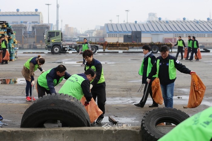 인천항만공사는 15일 내항 일대에서 인천항 유관기관 및 부두운영사와 함께 '봄맞이 합동 대청소'를 실시했다. 사진은 참여자들이 집게와 포대를 들고 청소하는 모습. (사진제공=인천항만공사)