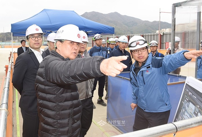 이교범 경기 하남시장이 최근 지하철5호선·하남유니온스퀘어의 사업현장을 방문했다. 사진은 이날 현장을 방문한 이교범 시장(왼쪽)이 공사관계자들에게 안전조치에 만전을 기해줄 것을 지시하고 있는 모습.(사진제공=하남시청)