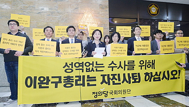 15일 오전 서울 여의도 국회 로텐더홀에서 심상정 정의당 원내대표 등 정의당 의원들과 당직자들이 이완구 총리의 자진사퇴를 촉구하는 피케팅을 하고 있다.